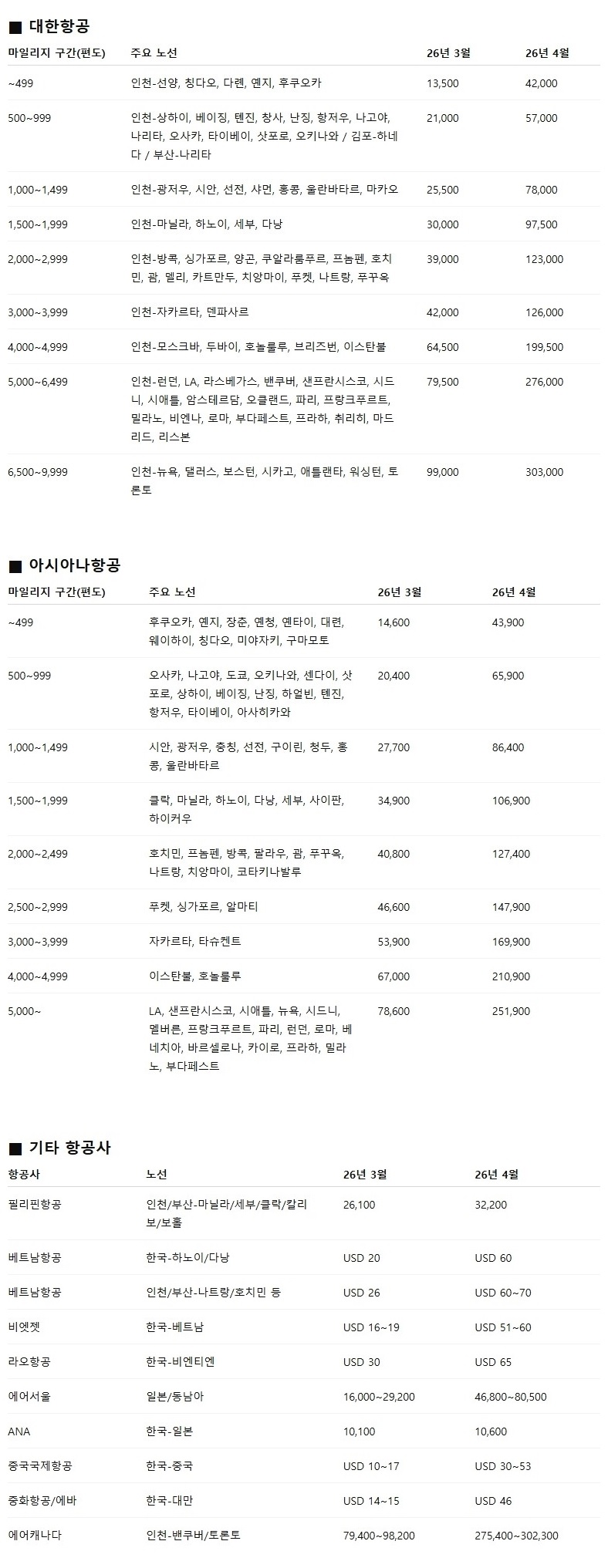 04.대한항공 및 아시아나항공의 경우, 취항하는 전 노선이 표에 모두 포함된 것은 아니며, 표에 명시되지 않은 지역이라도 동일한 마일리지 구간에 해당할 경우 동일한 유류할증료 인상분이 적용됩니다.